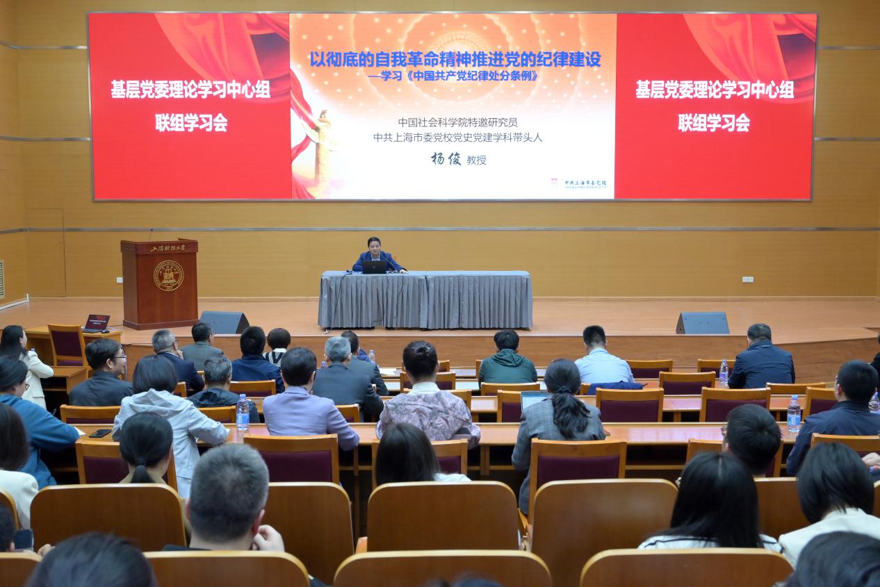 为贯彻落实2023年中宣部、中组部联合印发的《关于进一步提高党委(党组)理论学习中心组学习质量的意见》的具体要求,落实学校党委关于党纪学习教育的相关工作部署,4月26日下午,上海财经大学开展基层党委理论学习中心组联组学习会。联组学习会特邀上海市委讲师团成员、上海市委党校中共党史部主任杨俊教授,作题为“以彻底的自我革命精神推进党的纪律建设”的专题辅导报告。校党委常委、党委宣传部部长、马克思主义学院党委书记曹东勃主持会议。