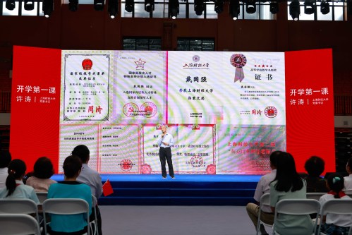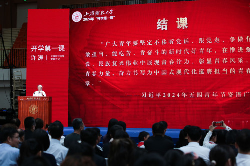 9月8日,上海财经大学2024级新生共同聆听书记第一堂思政课。课程主题为“一切为着建设祖国”,由上海财经大学党委书记许涛和师生代表、校友嘉宾及校外嘉宾共同讲述。课程共分为“前辈足迹共踏寻”“爱国情怀意正浓”“青春报国正当时”三个篇章,结合情景讲述、舞台剧、思政微课等生动形式呈现了上海财经大学“一切为着建设祖国”的光荣传统和新时代上财人矢志报国的坚守与担当。