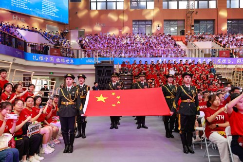 在国旗护卫队铿锵的脚步声中,全体师生起立,迎国旗,行注目礼,奏唱《中华人民共和国国歌》。
