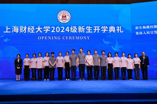 爱校荣校,肩负使命,共铸辉煌。姚玲珍副校长、朱鸣雄副书记为新生代表们佩戴校徽,全体新生同学面向校旗,举起右拳,庄严宣誓:用厚德博学的行动,追寻百年经济匡时的信仰,胸怀祖国、放眼世界、勤学修德、追求卓越,为中华民族的伟大复兴贡献一名上财人的力量。同学们将胸怀祖国、志存高远、修心立德、修学储能、勇立数字时代潮头,肩负时代使命。