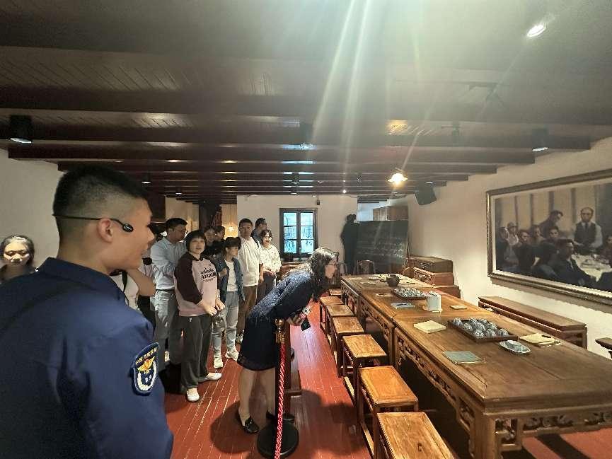 在讲解员的带领下,学院师生党员们参观了由“时局与形势”“筹备与召开”“发展与高潮”三个部分组成的主展厅。在场景再现厅,一张大桌子、一块小黑板,代表们拿着英文讲义进行着秘密会议,生动再现了中共四大召开的场景。中共四大在党的历史上第一次明确提出无产阶级领导权和工农联盟问题,为中国共产党从“宣传性的政治小团体”转变发展为“真正的群众性政党”奠定了基础。在参观过程中,党员们全面了解了中国共产党在艰苦卓绝的环境下,为实现国家独立、民族解放而艰苦奋斗的历史过程,让人仿佛穿越时光,亲历党的奋斗历程,深刻感受红色文化的魅力。