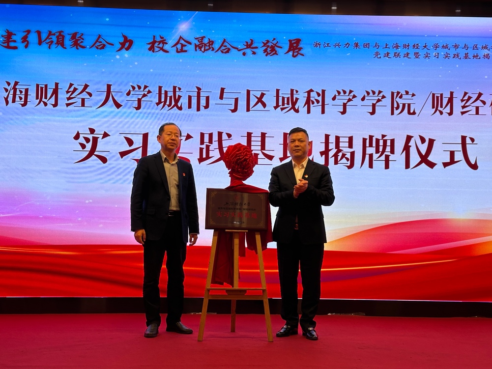 会上,浙江兴力集团董事长张国华与上海财经大学财经研究所所长张学良为实习实践基地揭牌。